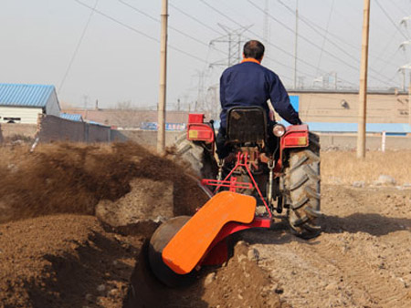 開溝埋藤機勞動強度大、作業時間緊、質量要求高。開溝埋藤這項繁重的勞動一直是由人工完成,作業質量差,效率低,成本高,已嚴重制約了生產的發展。 我單位的專利產品:前行走行間取土雙側開溝埋藤的研制成功,不僅大幅度提高了埋藤作業效率和作業質量,而且大幅度降低了勞動強度和作業成本,同時解決了不同種植行距作業的問題,可適用于大于150CM以上的種植行距,不受行距和地塊大小的限制,適用范圍廣,此專利填補了國內空白。